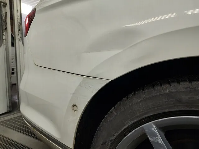 今回の修理は、リアフェンダーからリアバンパーにかけてのヘコミと擦りキズです。