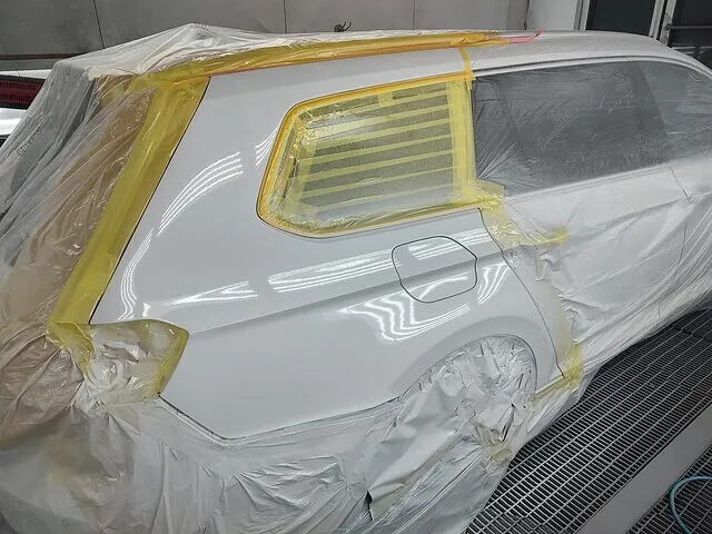 塗装ブース内で周囲をしっかりマスキングし、ホコリの混入を防ぎながら塗装作業を行います。